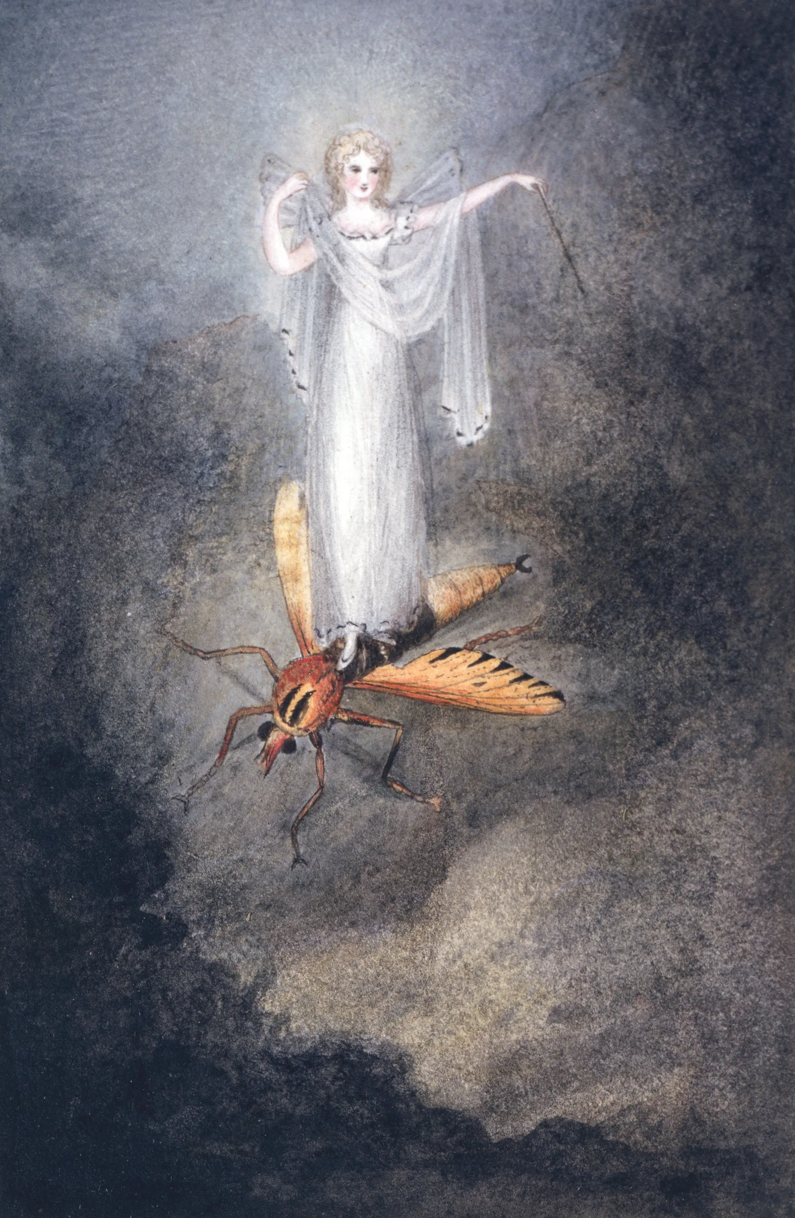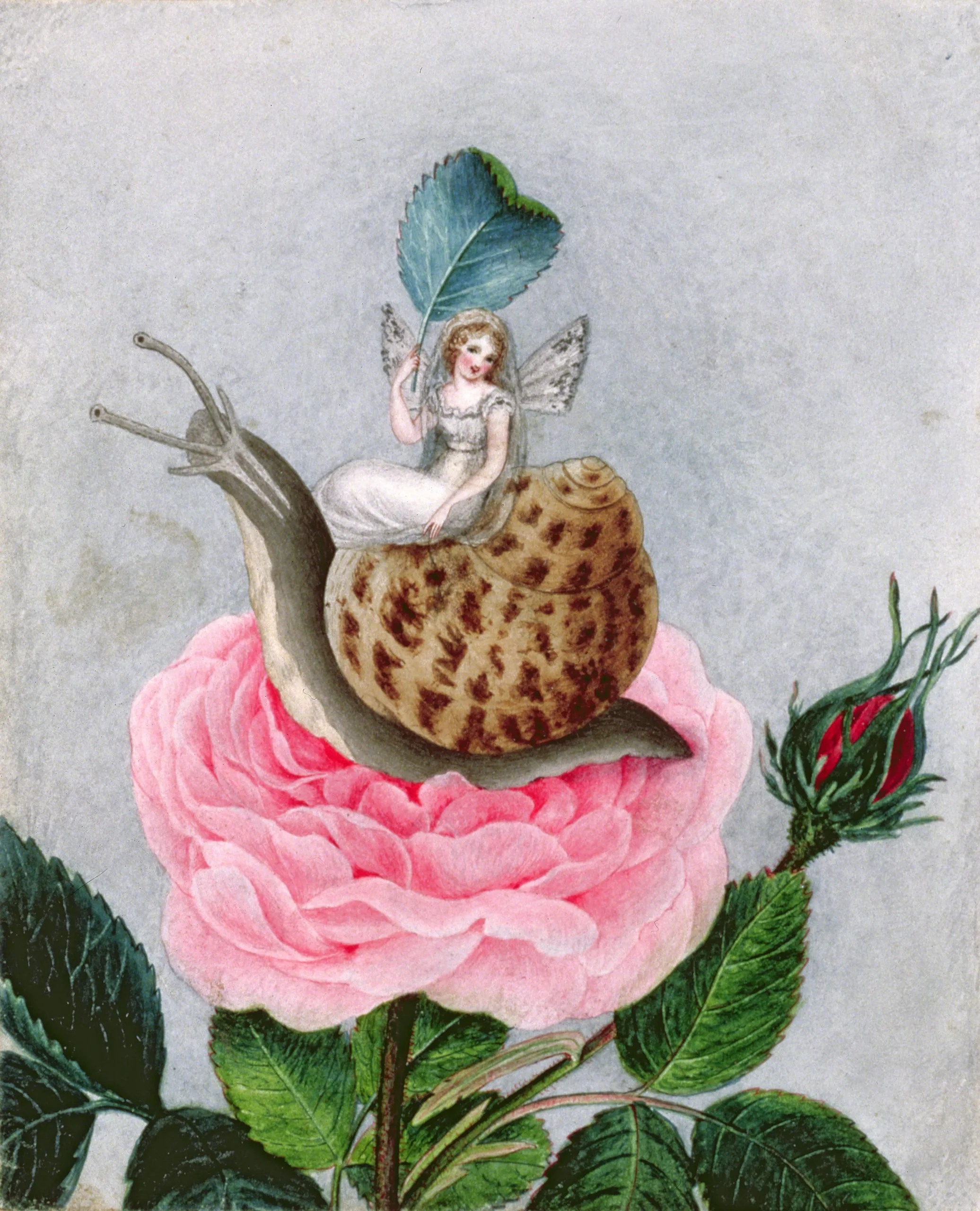 From the early 1820s until 1829, young Manx artist Amelia Jane Murray (1800–1896) rather obsessively painted fairies—smartly dressed and not overly active tiny creatures, that is, who reclined on feathers and stems and leaves as if they were chaise longues. Her fairies rode upon bats, bees, moths, and dragonflies; relaxed atop shells, on the backs of seabirds, and inside curving, flowering leaves that skimmed through the water; and occasionally swung in hammocks made of cobwebs strung among the blooms. They might perch on a snail on a rosebud, holding a leaf like a parasol. Like miniature Snow Whites (the Disney version), they are friends to all living creatures … except every living creature is their chauffeur—because these miniature fashionistas do not like to walk or use their wings, ever. Why should they?