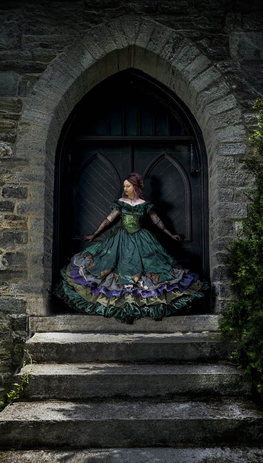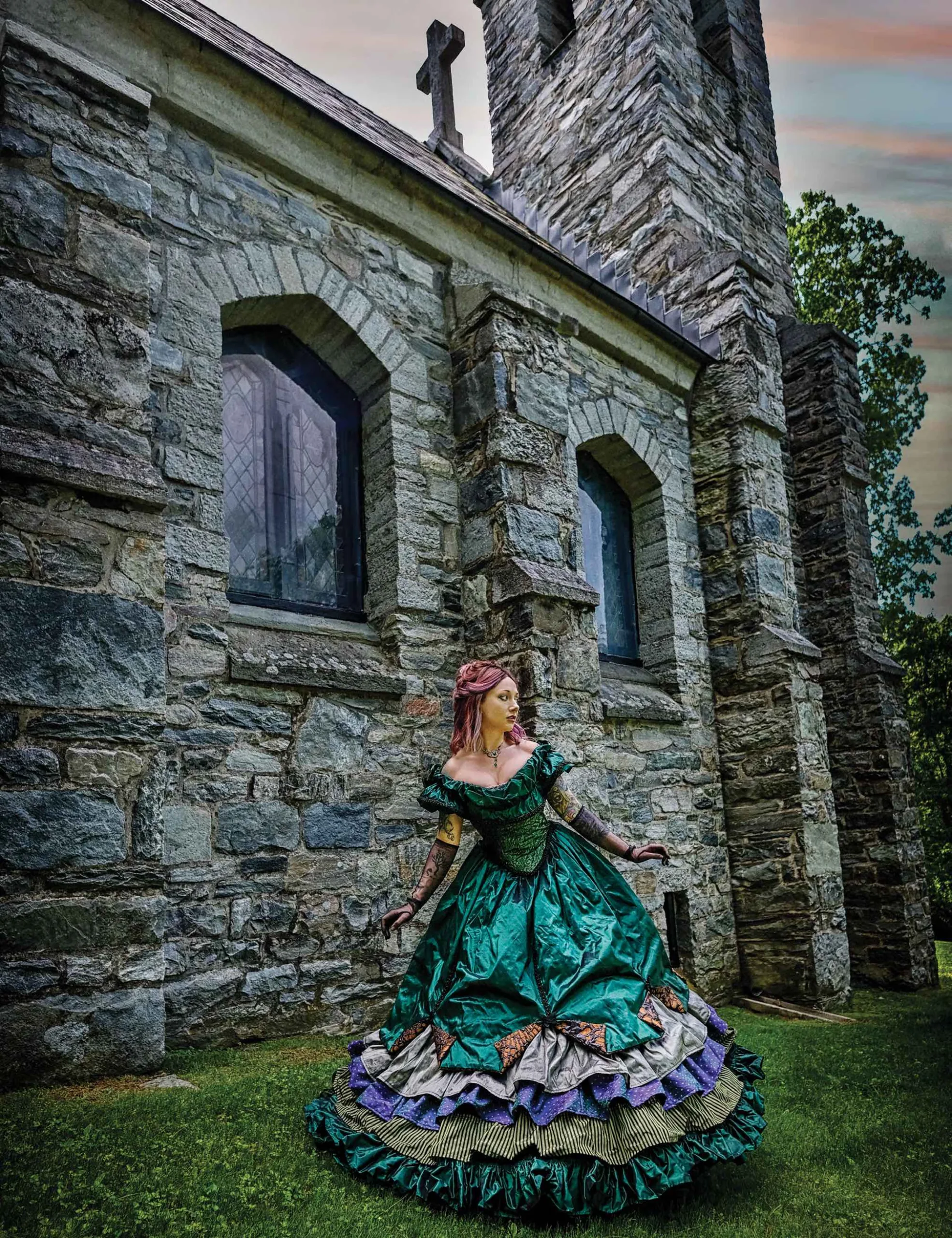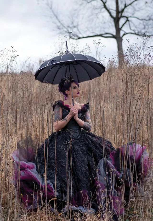 The images that grace the cover of this issue, as well as the opening pages of this story, are an indulgent contemporary gothic romance, from my gown to my skeletal tiara, to my purple hair and stark makeup. Long before my collaboration with photographer Steve Parke and Enchanted Living, I resolved to make myself a birthday present: a “gothic cupcake” of a gown, inspired by notions of beautiful and wicked stepmothers and unrestricted by historical accuracies. I wanted the gown to be as large as I could make it, and I gave it pockets. Unfortunately, the flu kept me from wearing the dress when I intended, so when Enchanted Living invited me to participate in their first gothic issue I said, “I have just the thing!”