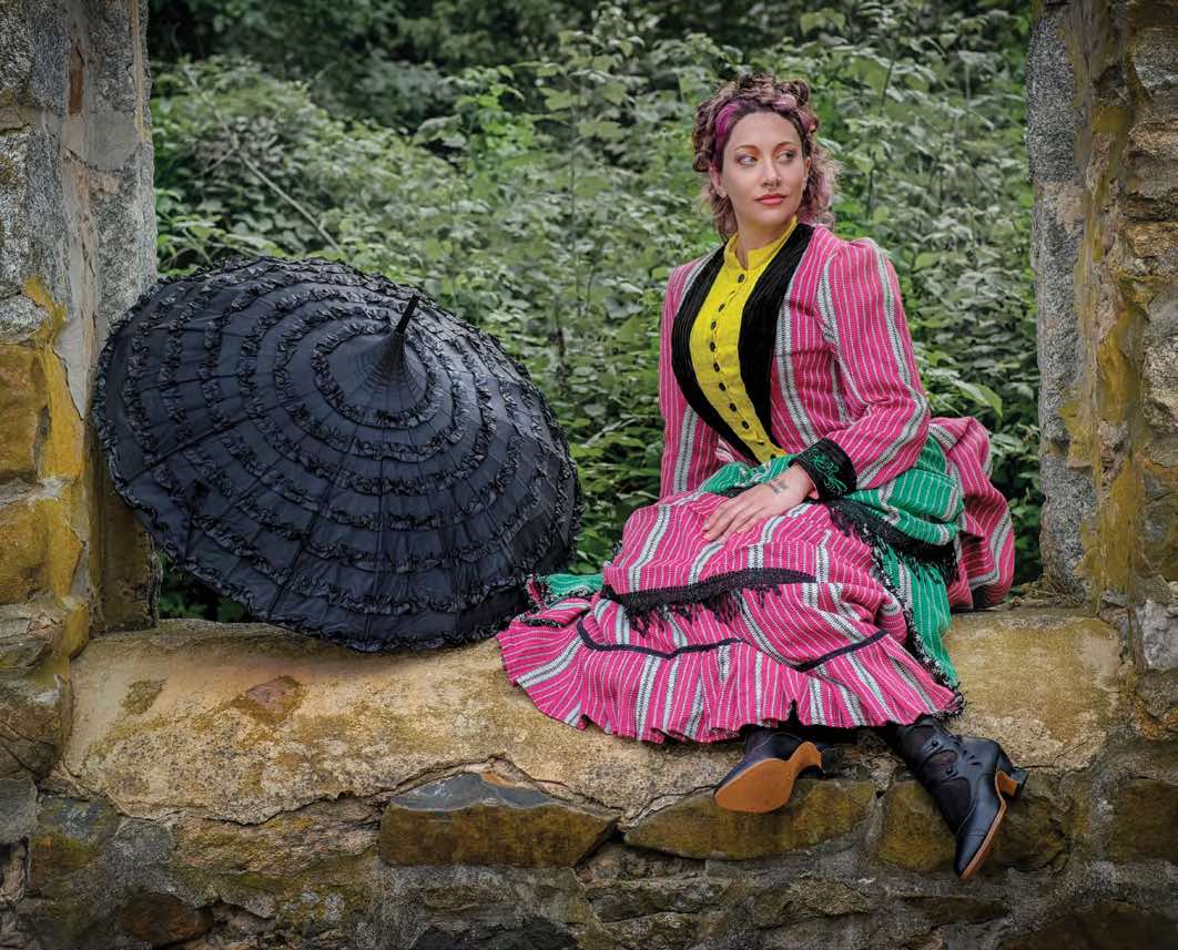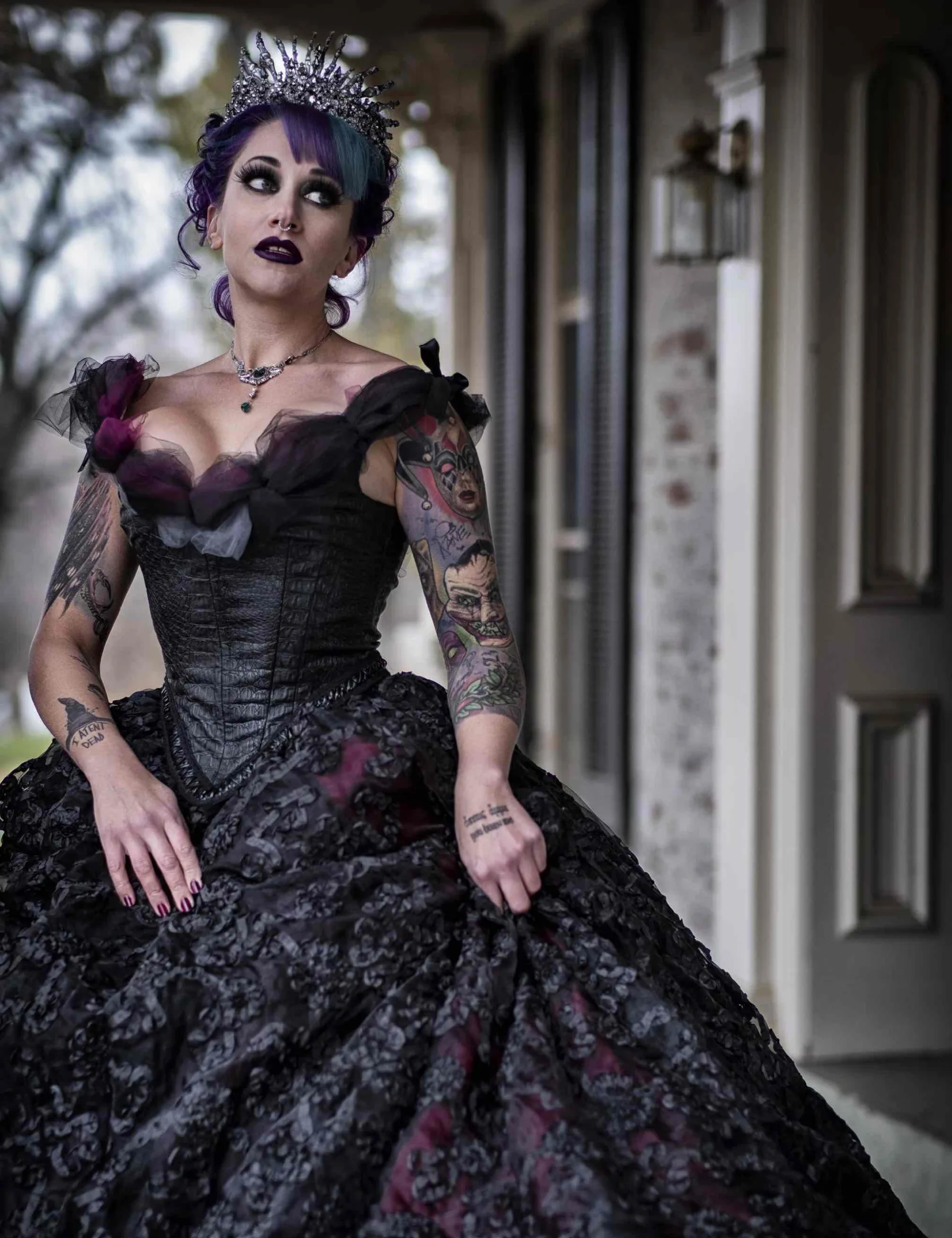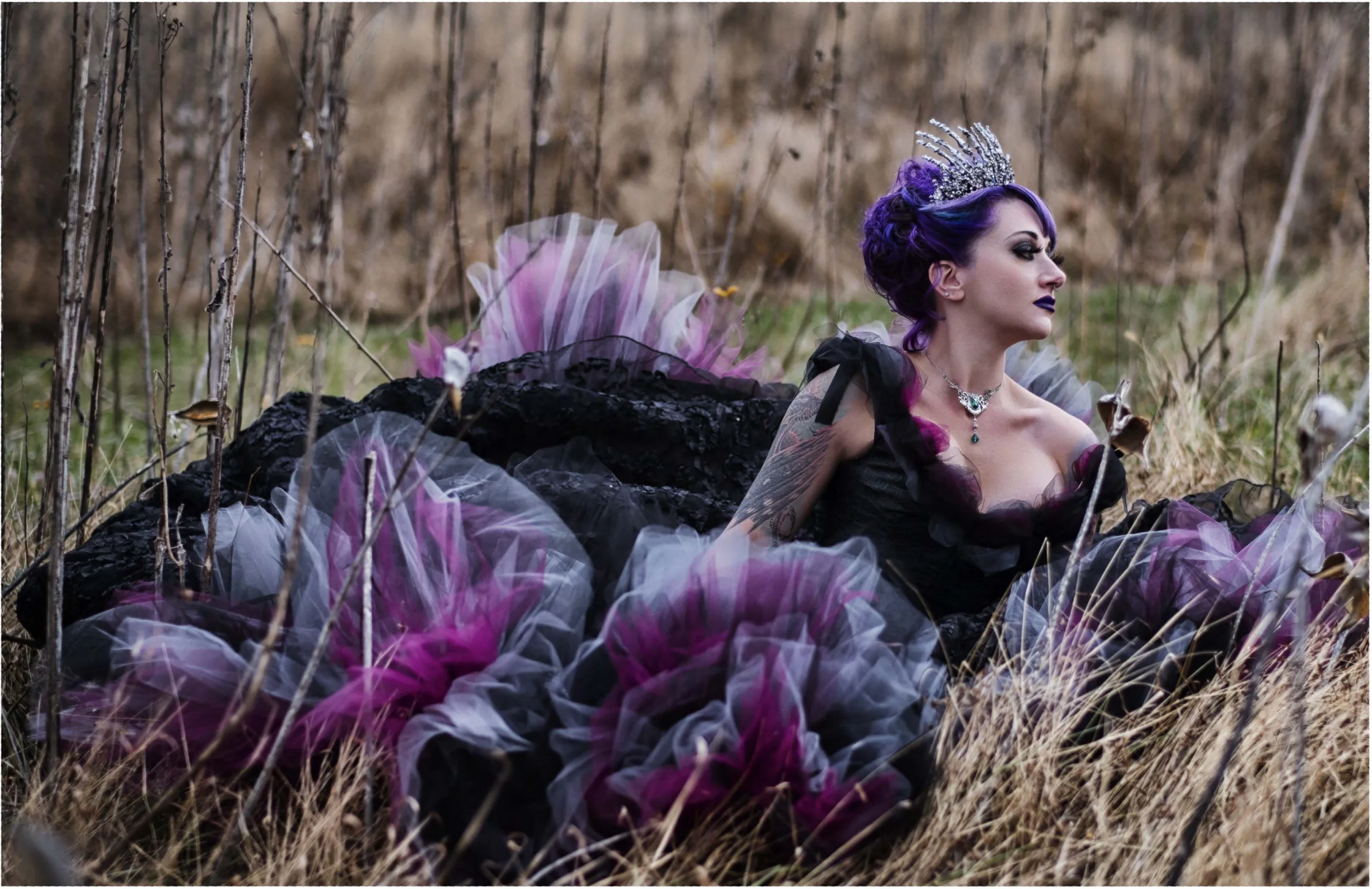 The images that grace the cover of this issue, as well as the opening pages of this story, are an indulgent contemporary gothic romance, from my gown to my skeletal tiara, to my purple hair and stark makeup. Long before my collaboration with photographer Steve Parke and Enchanted Living, I resolved to make myself a birthday present: a “gothic cupcake” of a gown, inspired by notions of beautiful and wicked stepmothers and unrestricted by historical accuracies. I wanted the gown to be as large as I could make it, and I gave it pockets. Unfortunately, the flu kept me from wearing the dress when I intended, so when Enchanted Living invited me to participate in their first gothic issue I said, “I have just the thing!”