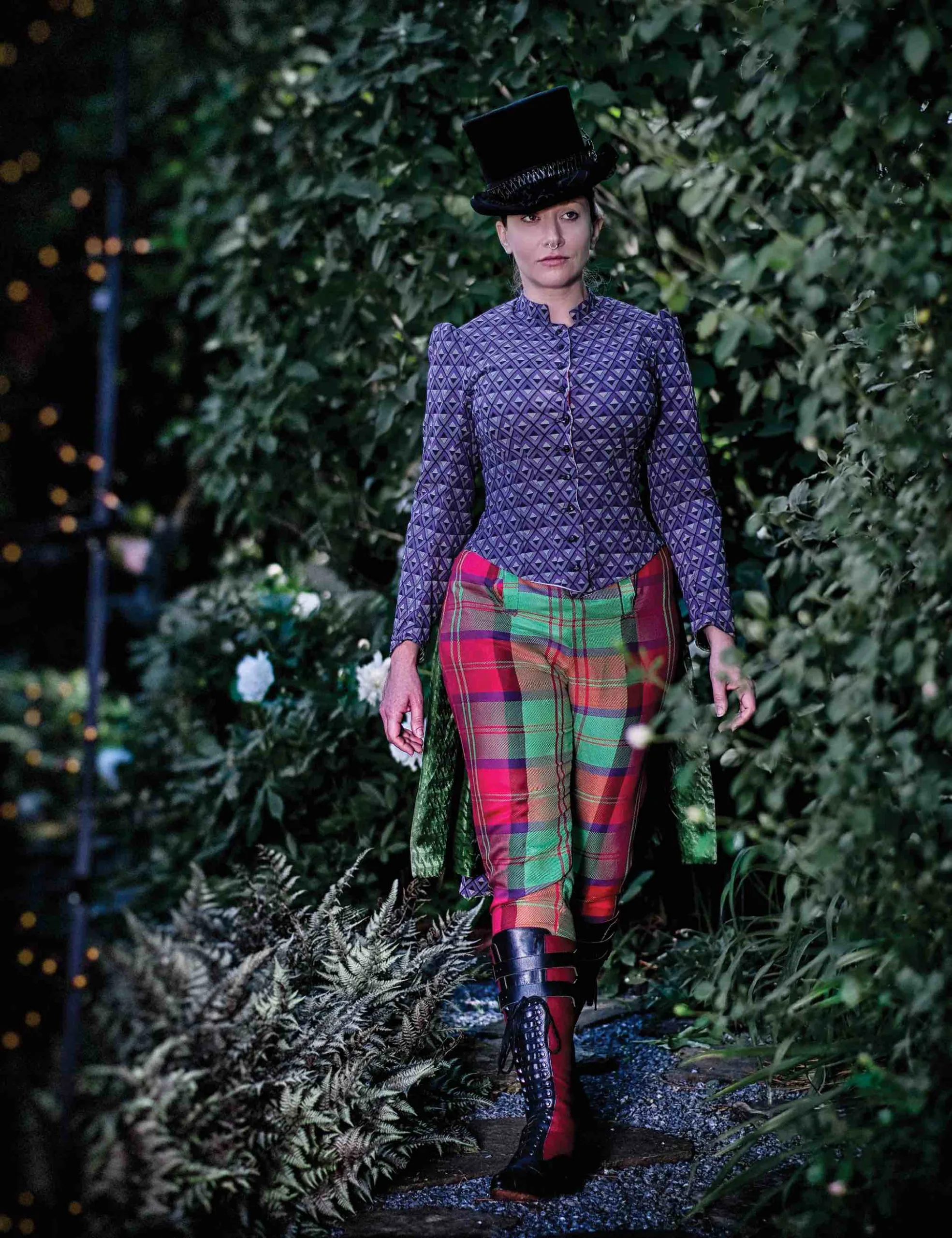 In fit I found my lack of experience limiting. I made the breeches in a plaid wool but fit them without a corset, which was itself needed to give the proper shape to my tailcoat. The men’s shirt, with its delightful removable collar and cuffs and skull studs, was too long and bulky to fit well in the pants. But the tails—oh, the tails! There is a detail I stand behind. Using a pattern drawn by Truly Victorian from an 1883 Harper’s Bazar, the bodice has a feminine cut with powerful energy that looks best when you turn your back on someone. Like the walking dress, the devil’s in the details, from a long row of black skull buttons to the arsenical green lining.