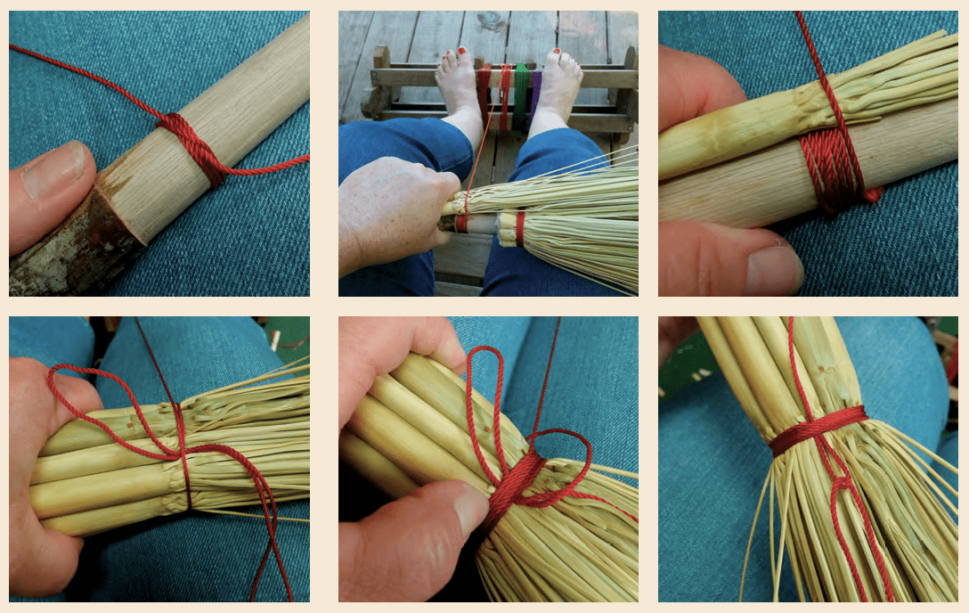 Secure the end by tying a single overhand knot in the twine about an inch away from where it emerges from the broom after the last stitch, then pushing the needle back through the broom to bury the knot in the broomcorn. Add more rows of stitching if desired.
