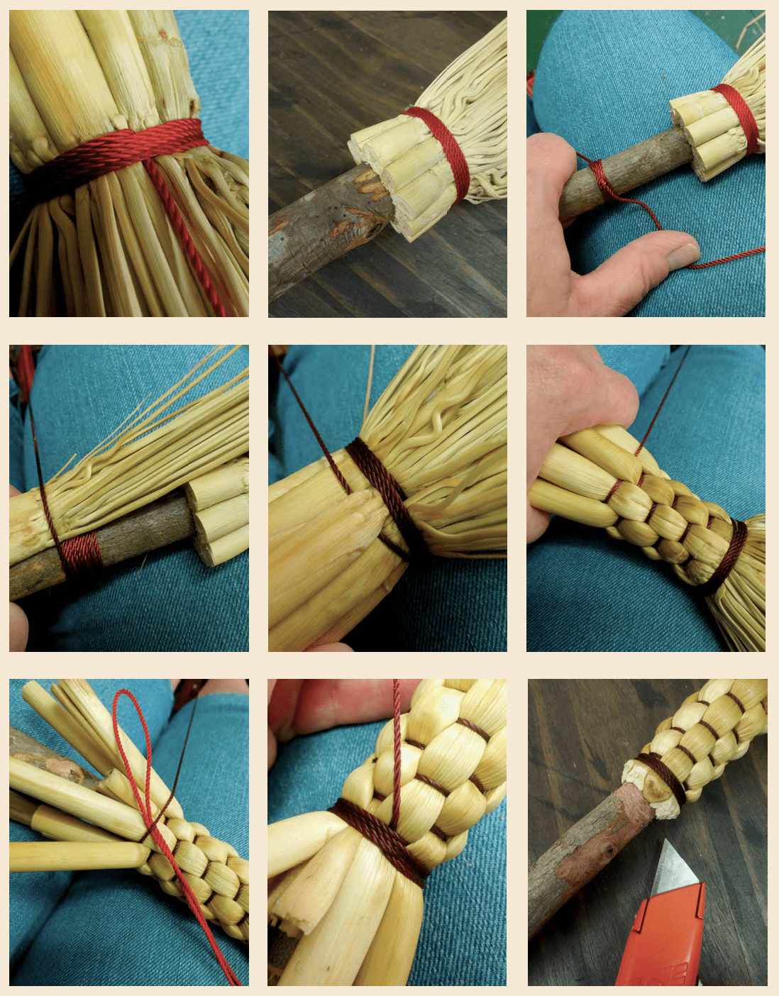 Secure twine to handle, about 2 inches above the ends of stalks on the first row of broomcorn. Begin adding second, outer, layer of broomcorn using the same procedure as for the inner layer. If you wish to weave the stalks after binding them on, make sure to use an odd number for the outer layer.