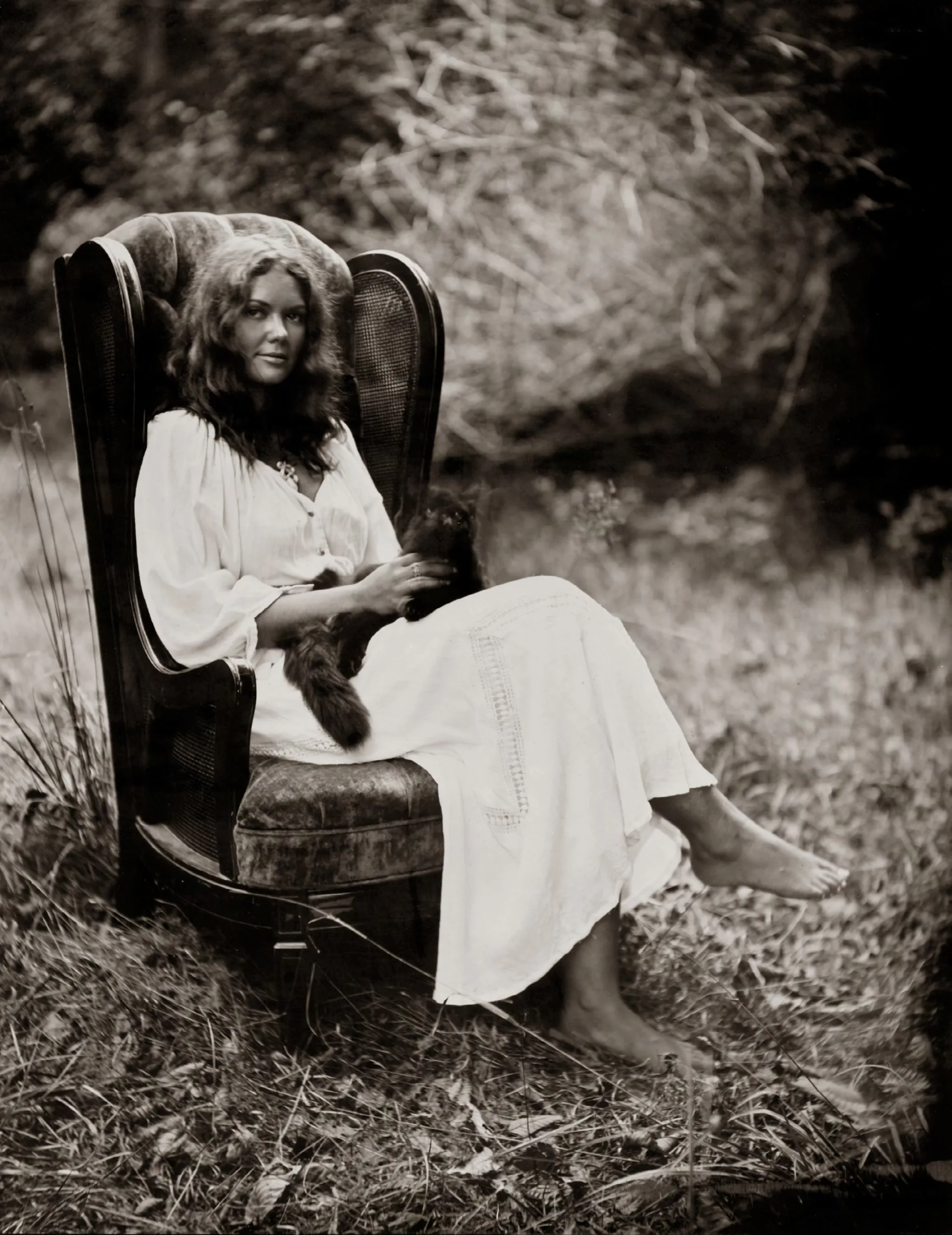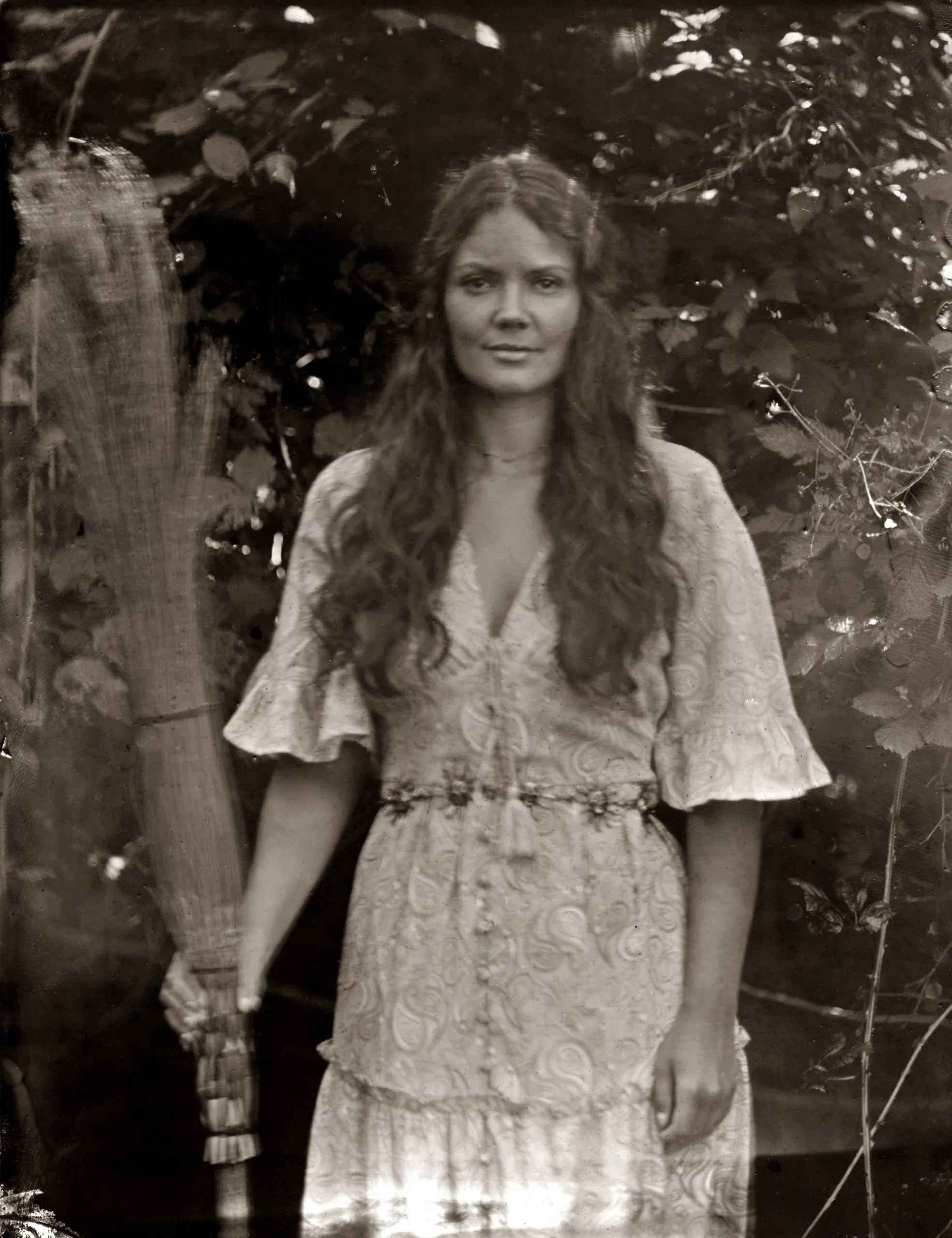 The result is haunting, as in the photo to the right, where Shambrook holds the first broom she handcrafted and wears the outfit she once wore to handfast a fellow witch on the previous new moon. She’s standing on the land that she’s been restoring for four years, turning a junkyard on Vancouver Island into an enchanted forest. When her family purchased this land in 2019, it came with more than 10,000 pounds of dumped garbage. Now flowers, grass, and moss are growing again. The forest is filling with green along with foxgloves and other plants. Taken with a twenty-five-second exposure on glass, this image symbolizes the integration of Shambrook’s shadow self and the reclamation of her—and her land’s—power. It’s a “portrait of a witch standing her ground,” she says.