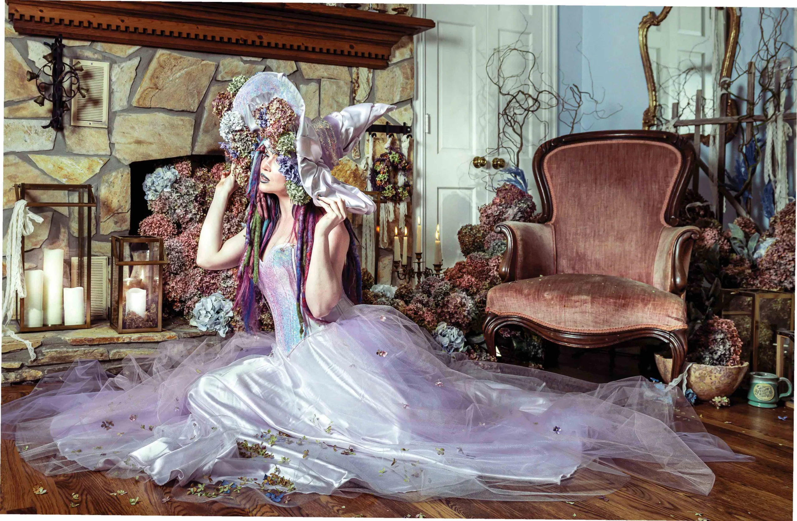 Meanwhile, in Maryland, artist Brenna Mills was also gathering and drying hydrangeas. When the online friends realized their mutual obsession, they hatched a plan for a photo-shoot meetup. Mandy Tweed of Mountain Flower Fantasies agreed to create a fae-worthy gown, and after hand-dying and cutting fabric, she mailed remnants to Mills for her to use in creating “a Southern-garden-style witch’s hat that would make Aunt Frances and Aunt Jet proud.” Inspired by Kirsty Mitchell’s amazing photography, Mills (and her late grandfather’s glue gun from the 1980s) created the hat seen here, with dried hydrangeas spilling forth and over the brim.