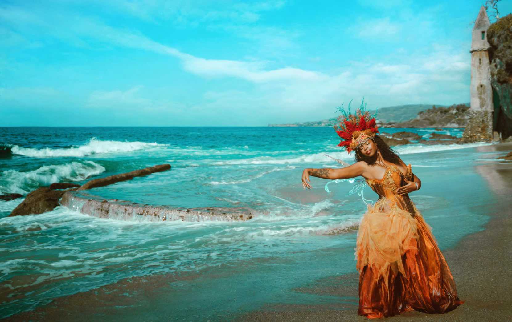 We met up on a sunny day in Laguna Beach. As Yiaz gathered her things, I said a silent prayer, trusting in the universe and my magic within to be courageous and to continue creating memories like that special day, but most of all to have kindness and grace with myself, allowing light and love to take root. Yiaz adorned me with an elaborate crown of feathers and beads and a gown evoking the fiery energy of the sun. We set up on the beach and allowed the wind and water to lead the dance of the elements.