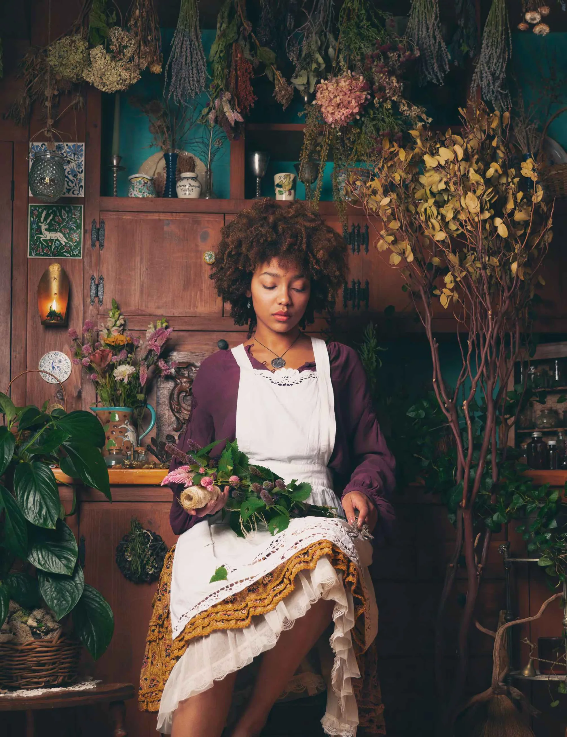 Photographer Joy Marshall, model (and wingmaker) Tatiana Pimentel, and jeweler artiste Jen Parrish-Hill of Parris Relics collaborated on this shoot to celebrate the green witch in all her guises, filling Parrish-Hill’s kitchen at Frog Hollow—her magical abode in the hills of Massachusetts you might remember from our summer 2016 issue—with dried flowers, baskets, bottles, trinkets, and as many bright green plants as possible. “It was easy to envision what a green witch would do in that space,” Marshall said after. “Jen’s kitchen is naturally a green witch haven!”