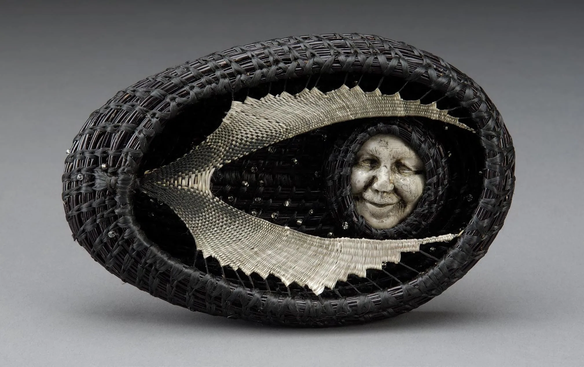PZ: The “Catching the Moon” series was an outgrowth of my face baskets, the first of which was a gift for one of my children’s teachers. It was very emotional, putting that face in the basket. I’m still trying to figure it out. Faces attract us. The faces draw people in who would not otherwise look at a woven piece. I have been told by some other artists that faces are wrong in baskets. As far as I’m concerned, that is as good a reason as any to keep making them! But many of my weaving ideas come in the middle of the night, and that is how the “Catching the Moon” series started, when one of my children was not sleeping well. Lots of nights. Lots of moons. Even after he started sleeping better, there were more moons. They all had something different to say. The middle of the night is like that.