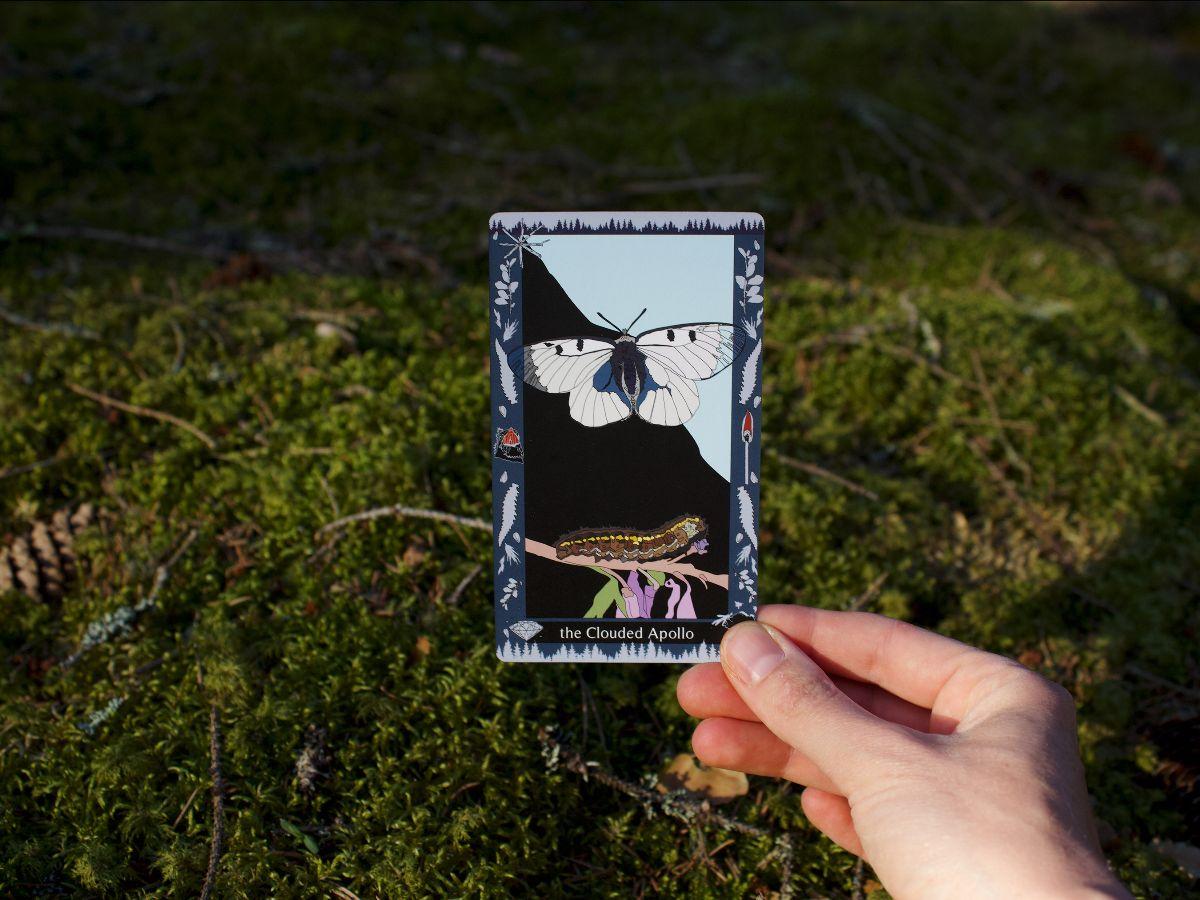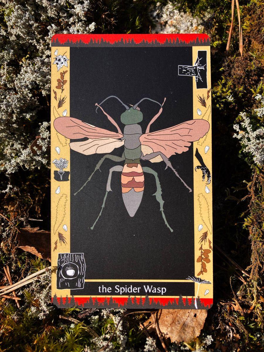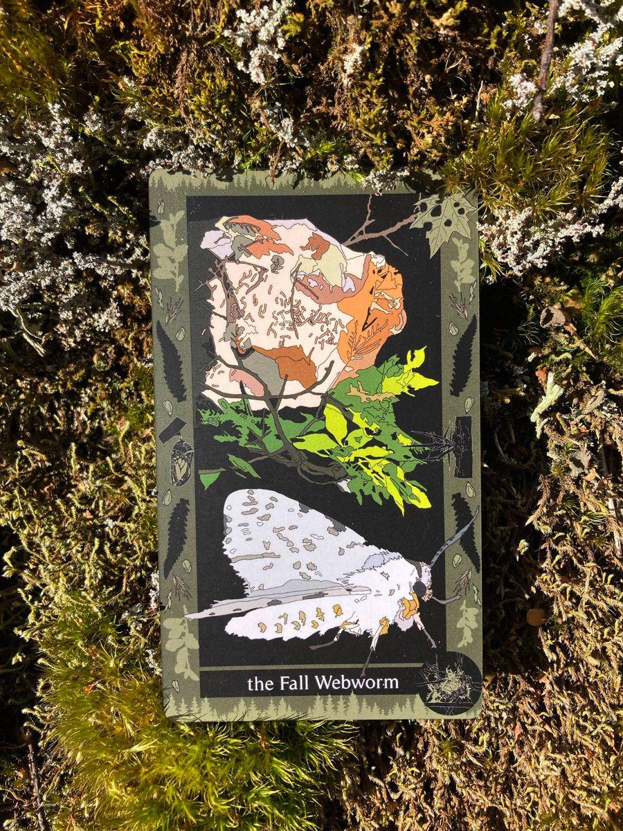 I thought about Glowwood for years before I was actually able to sit down and create it start to finish. That period before the deck was filled with other projects, other dreams, “auxiliary engagements” like woodswalking, reading, foraging, a happenstance children’s summer camp—which eventually formed the structure from which the deck could stem. These external activities were Glowwood’s inheritance; they are the salt of it, the real longterm investment, and Glowwood is their expression. Of course, once I did have the luxury, protection, and personal space of giving Glowwood my undivided attention, it took about a year of reclusive moonlit silkspinning to give that expression a form. So does the Webworm lushly sheathe itself in silk and anything loose that can be found and used for warmth to envelop…the nascent promise. So much more I could say about this card regarding Glowwood’s beginnings, but I’ll stop here.