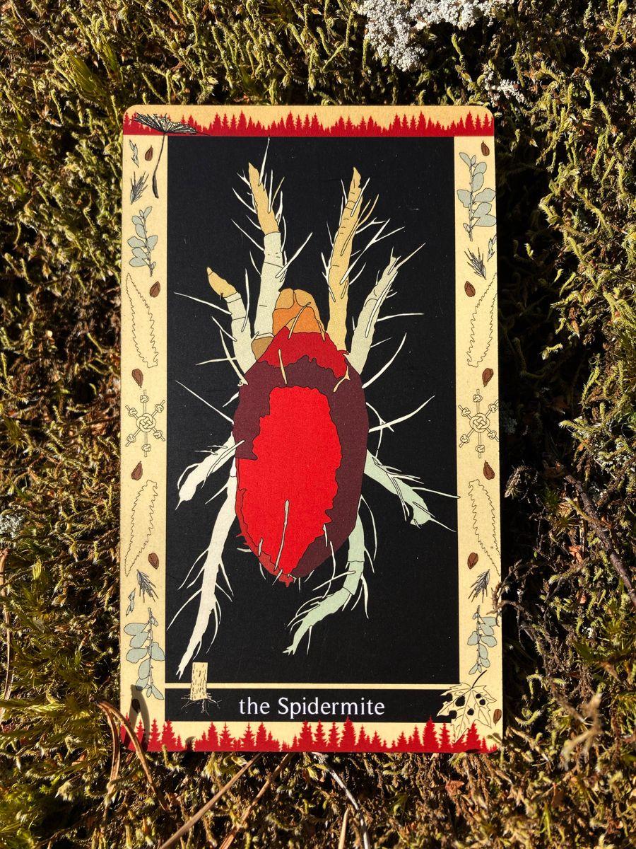 A bold statement from the Spider Mite and somewhat expected. Deep within Glowwood’s bedrock, running up and down its nervous system, is the ecological model: a non-hierarchical system where each being plays a unique role. It is also non-archetypal, so while no single “self” gets center stage, each lives a full, complex, idiosyncratic life, that is always intimately tied to the lifeways of others and to the system entire. Why does the Spider Mite sound so militant? Because the “old model”, as we all know by now, is also the model of heroes, human kings, avarice, and arrogance. It’s also the vulnerable model — kings are easily usurped. The webbed or rhizomatic structure (which is depicted on the card backs) distributes power across loci, setting off risk. Thinking together with this, through Glowwood, feels a bit like when your ears finally pop after flying or being underwater. A barely perceptible movement resulting in profound experiential effects.