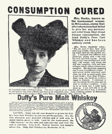 + Ads for Duffy’s included the following spokeswomen: Mrs. Henke, “known as the handsomest woman in Milwaukee,” who was cured of consumption after physicians failed her; Miss Susie John Cotton, who came down with pneumonia while traveling by train and was given Duffy’s by a minister; Miss Mae Rodgers was cured of bronchitis; and Frances Burton (116 years old), Mrs. Susan Baker (101 years); and Mrs. Priscilla Martin (93) attested to Duffy’s claim as “the Great Renewer of Youth.”