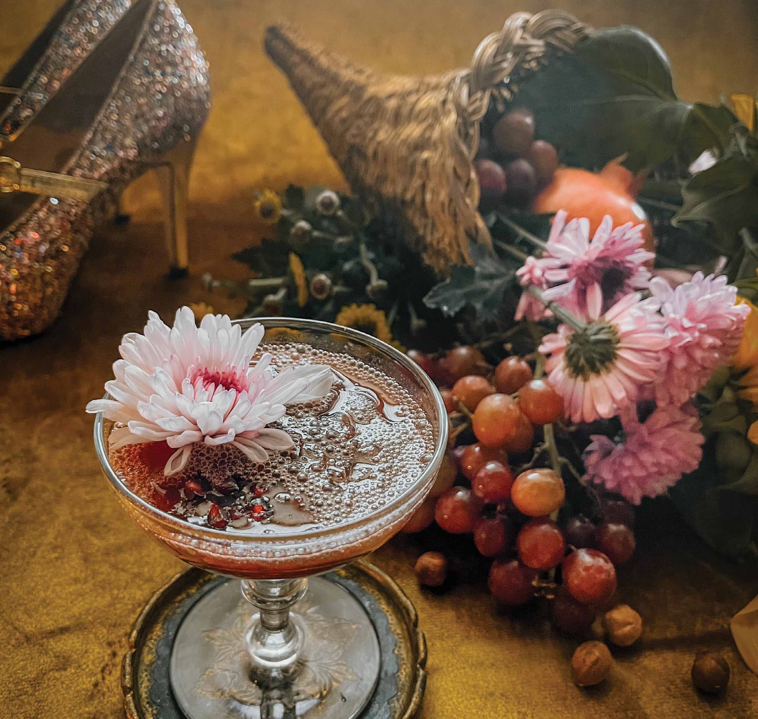 Don’t partake in spirits? Add a luscious splash of pomegranate juice, kombucha, or even sparkling water to top your cocktail. The magic remains.