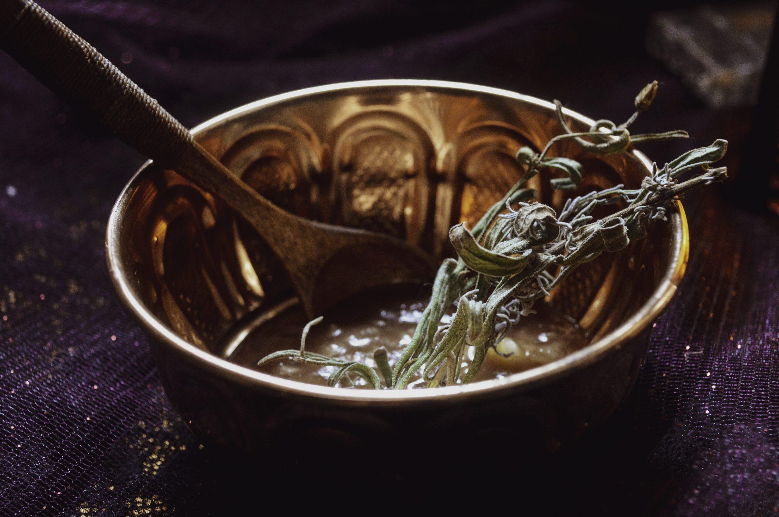 This is a blissfully simple potion, but it does require a very ripe banana (lots of brown spots) because it needs to be so soft that it can be made into a smooth, creamy confection. In a bowl, mash the banana thoroughly with a mortar (you can use a potato masher or fork if you don’t have one) until it is completely smooth. Add in the black currant juice, and mix well clockwise with a spoon or small whisk. Next, stir in the Abyssinian oil, and lastly the cinnamon. As you concoct, feel and see your nearest and dearest Big Plans coming to fruition. Ask what you need to do to help it along. Ask to be shown how you can support that desire, even if you think you’ve done it all.