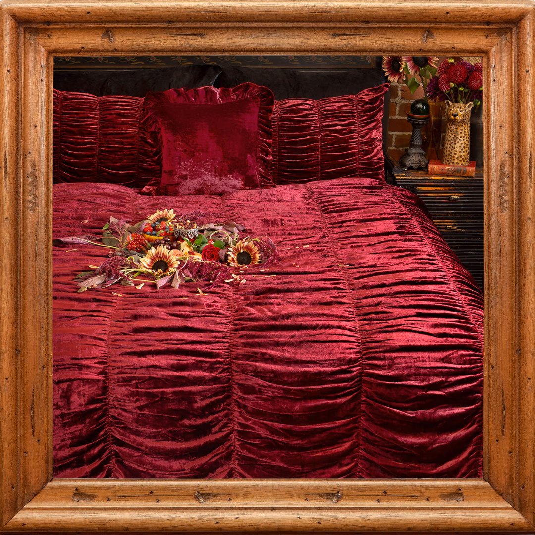 Make every night a sacred ritual with Sin in Linen, created with a nod to the unusual and a wink to sensuality. Luxurious textures, rich hues, and mystical motifs set this glamorous bedding apart, making it the perfect addition to your home this autumn. Featured here are NEW Scalloped Velvet Duvet Covers. Oh, the drama!